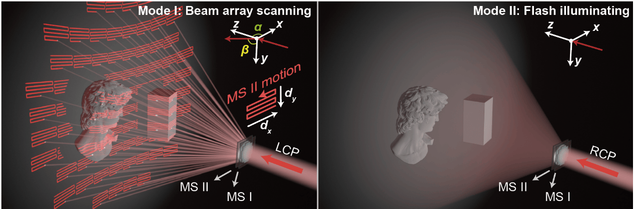 核心突破在于团队设计的“混合级联平动超表面”器件。该器件由双层纳米级光学镜片构成,通过调节入射激光的偏振特性,可使系统在扫描模式与闪光模式间自由转换。扫描模式下,系统可精准捕捉500米外目标的细节特征;闪光模式下,则能实现120度视场角的即时三维成像。